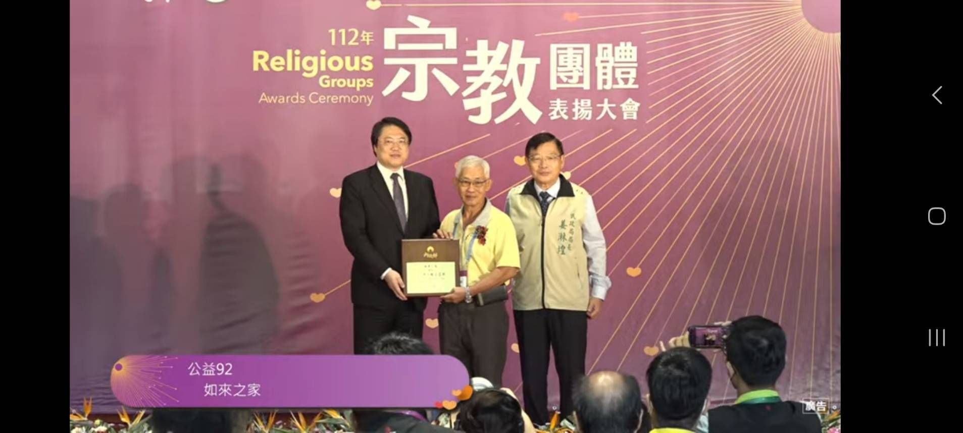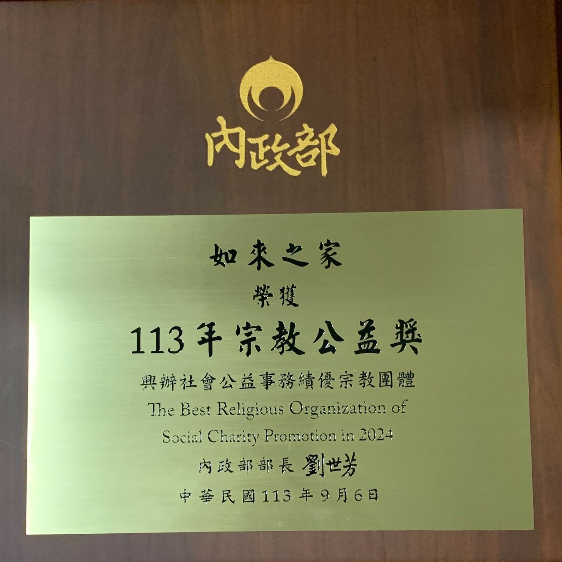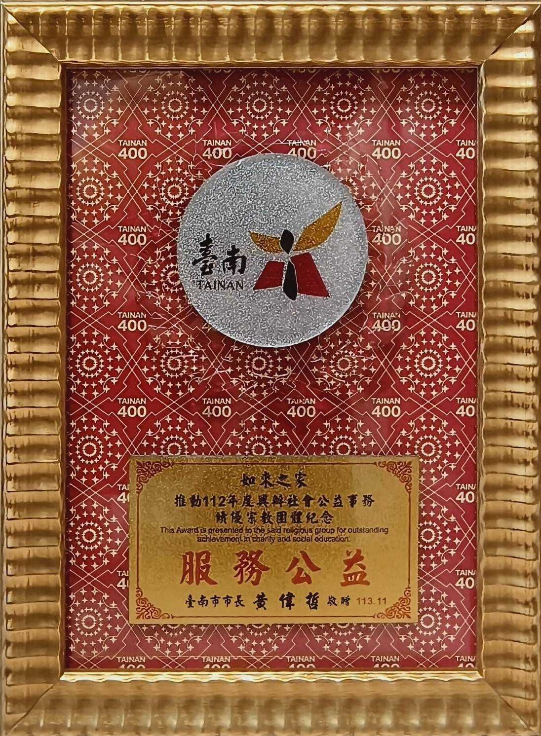 「台南市113年績優宗教團體興辦社會公益表揚大會」,11月28日(四)於福爾摩沙遊艇酒店舉行。由台南市市長黃偉哲頒獎,內政部宗教及禮制司林清淇司長蒞臨指導,表揚台南103個績優卓越宗教團體,如來之家再獲殊榮,由教育總召張雅鈴老師代表受獎。